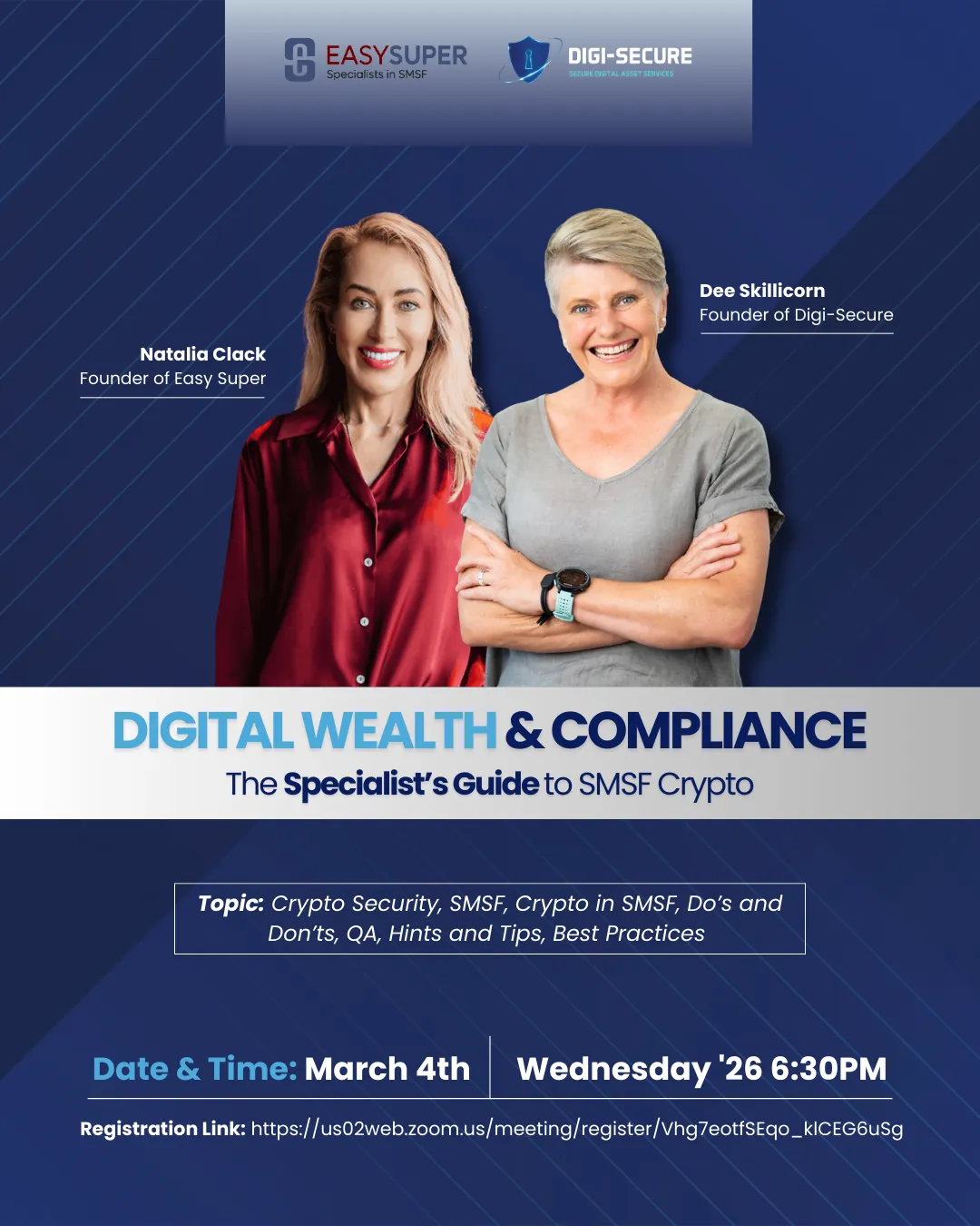 On March 4th at 6:30pm QLD time, Natalia Clack from Easy Super and I are walking through exactly what needs to be in place for your SMSF to hold crypto properly, from investment strategy wording to purchase documentation to security protocols to audit requirements.
